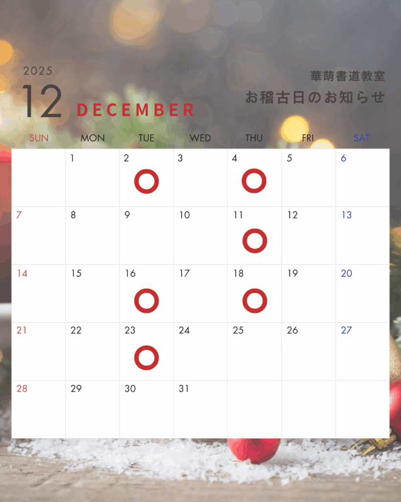 華萌書道教室では、12月も火曜・木曜にお稽古を行っています。